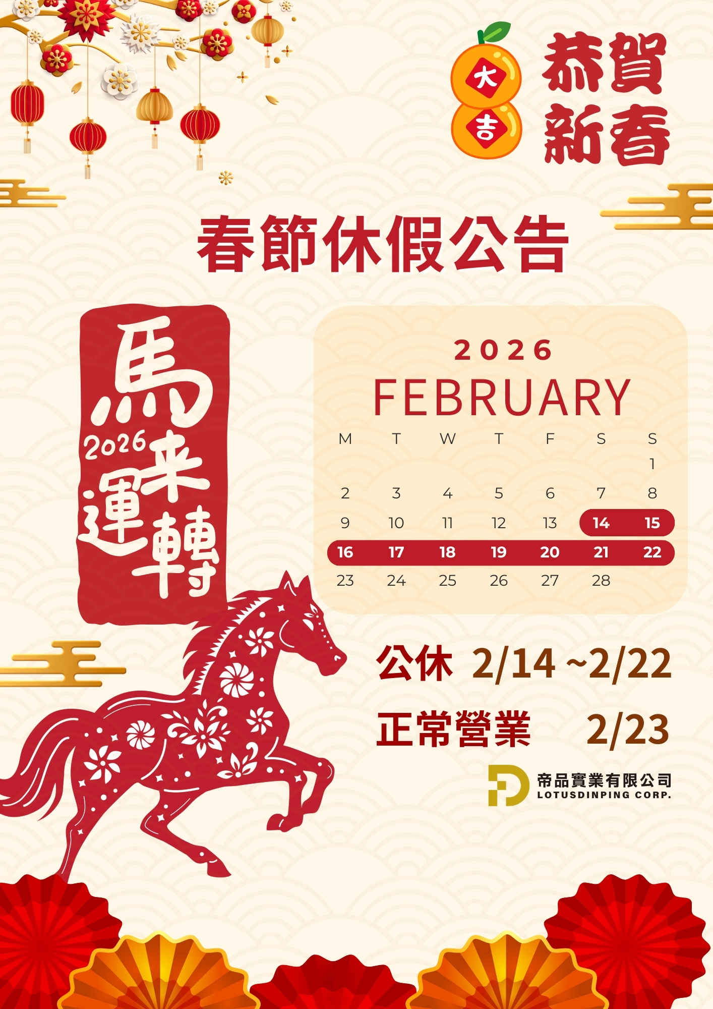 本門市將於 2026/2/14 ~ 2/22(農曆春節連假)公休,